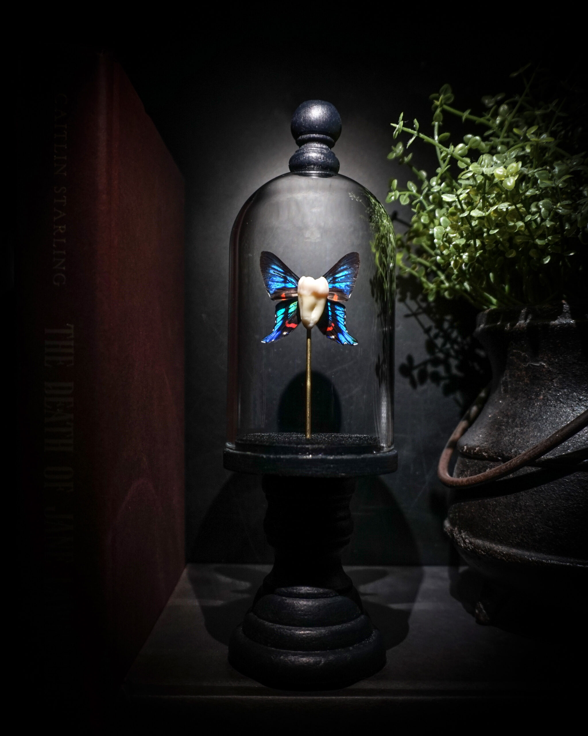 (Featured) 1. A one-of-a-kind Tooth Fairy unlike any you’ve ever seen. Handmade using a real human tooth and ethically sourced butterfly wings, this tiny creature blurs the line between folklore and the macabre. 2. Squirrel: This woodland glass cloche, featuring a delicately preserved squirrel skull surrounded by acorns, gold detailing, and forest litter, brings a moody, naturalist elegance to any shelf or altar.