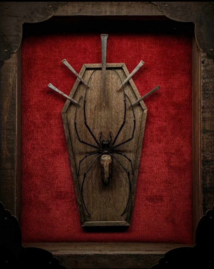 First image: From the Funeral Collection, this display houses a massive Golden Silk Orb weaver that is mounted on a handmade coffin-shaped embellishment. The embellishment is crowned with 5 coffin nails which served as the main source of inspiration for this collection.
