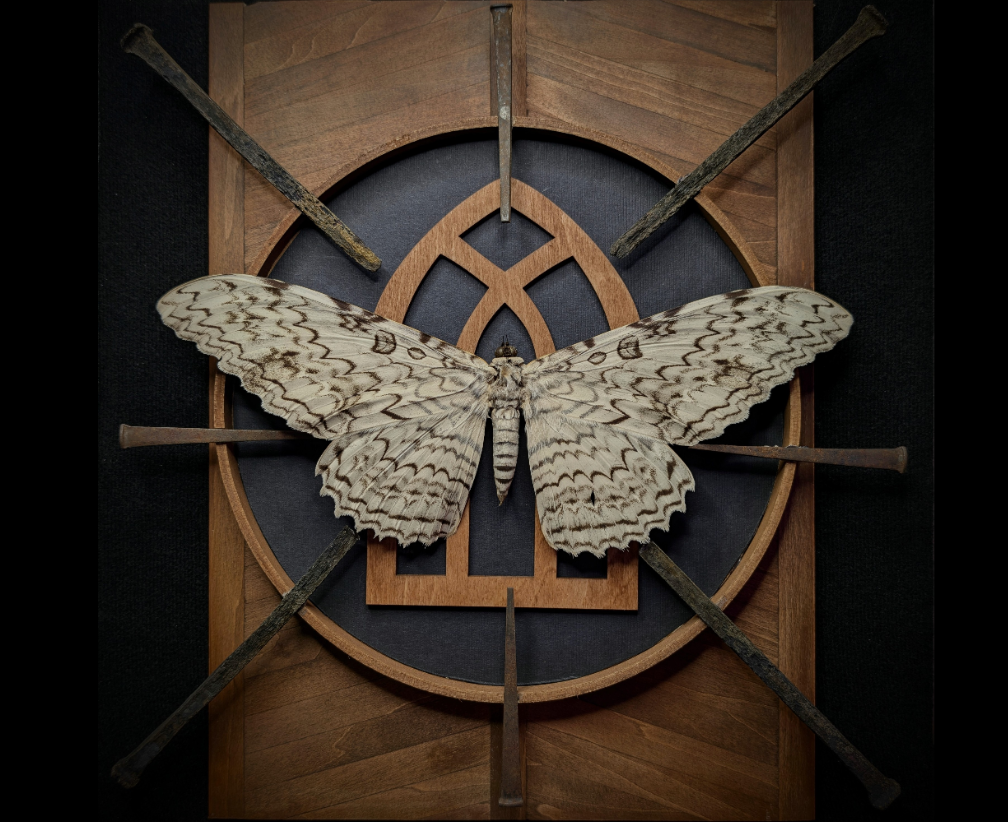 Second Image: A display inspired by the interior of a friend’s recording studio, a White Witch Moth is mounted over a cathedral window and a handmade wooden lattice which is encompass by 18th century hand-cut nails that were harvested from the front door of the studio that inspired this work.