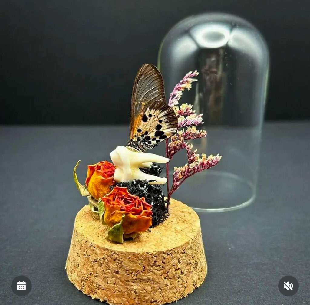 One of a kind Entomology frames and elaborate terrariums are created using ethically and sustainably sourced organics and oddities, each work blends dark enchantment with artistic intention, inviting viewers into a magical realm where the strange becomes beautiful.