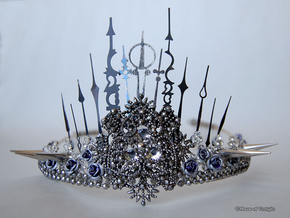 (Featured) Antique Bee Baby pendant, created using a porcelain doll from the early 1900’s, and vintage rosary bead chains; Tiara created from Victorian steel cut buckles, and antique watch & clock hands; Vintage rolled-gold watch case with vintage rhinestones & Austrian crystal cat, and vintage rosary bead chains.