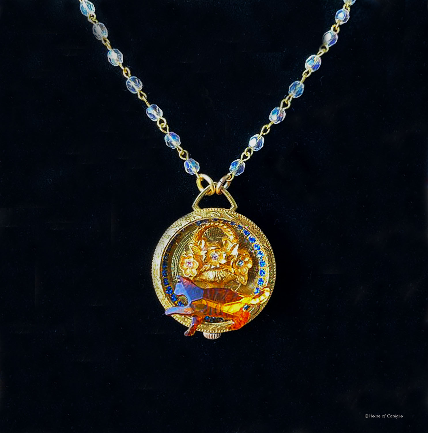 (Featured) Antique Bee Baby pendant, created using a porcelain doll from the early 1900’s, and vintage rosary bead chains; Tiara created from Victorian steel cut buckles, and antique watch & clock hands; Vintage rolled-gold watch case with vintage rhinestones & Austrian crystal cat, and vintage rosary bead chains.