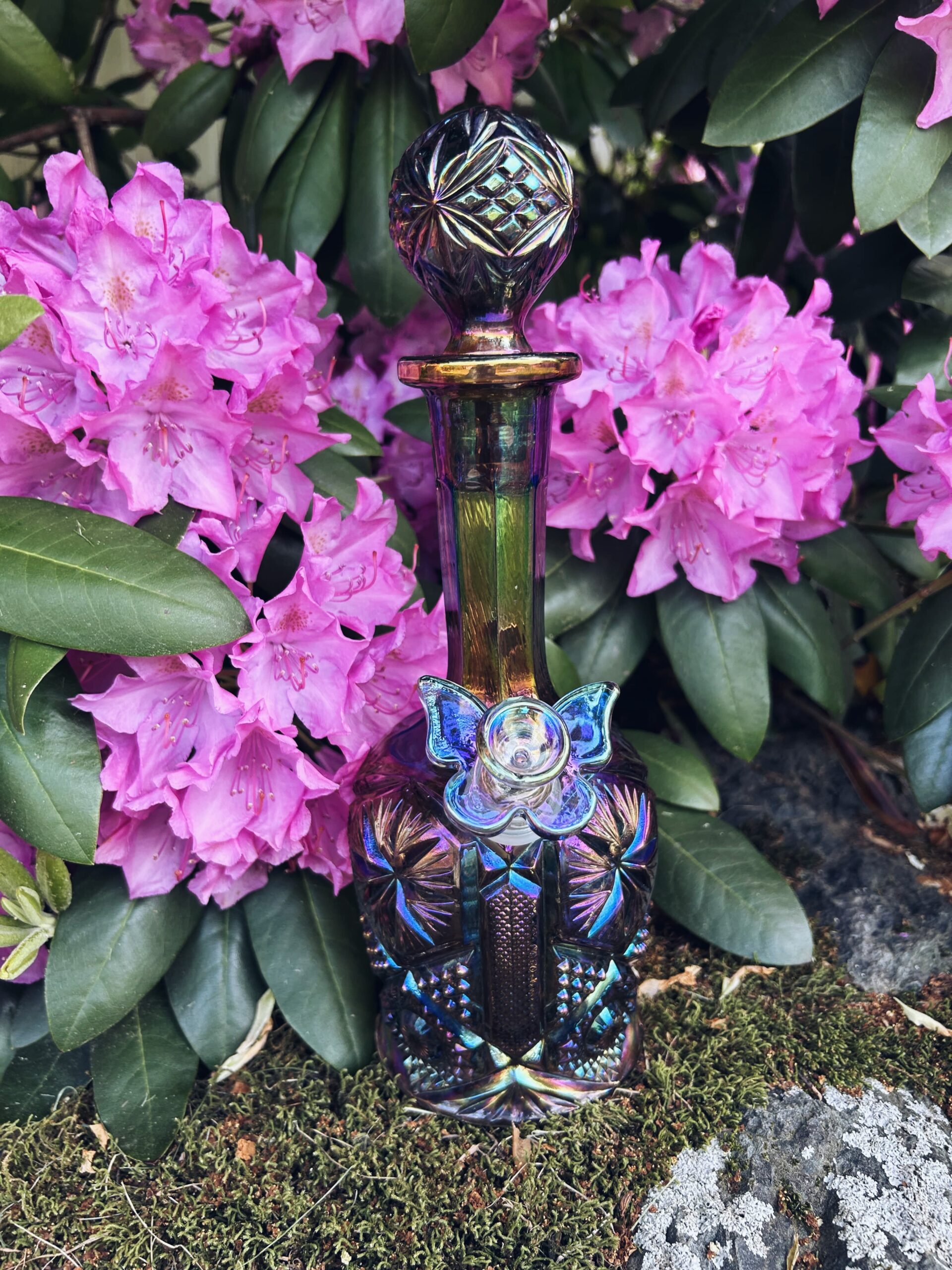 (Featured) Dark and enchanting, this is 1910s-1920s Imperial Carnival Glass Star and File decanter in the color smoke is a witchy tokers dream piece. The color shifts on the 100 year old piece are beyond words, almost otherworldly. Plus- the foreshadowing on the name? Beyond!