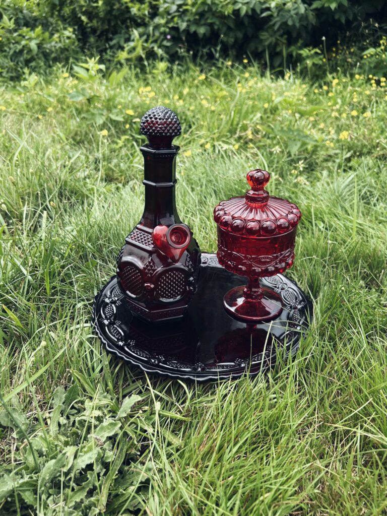 (Featured) Dripping in vampire vibes, this 90s ruby red Avon Cape Cod and Mosser Eyewinker set are to die for. The deep blood red screams romantic goth stoner. Who would’ve thought smoking could look so dreamy?