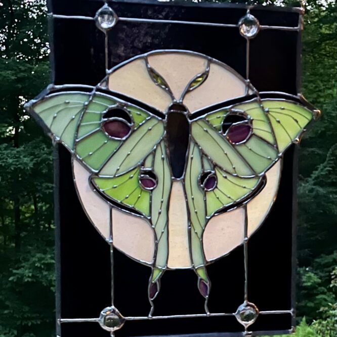 Salem Yule Marketplace Vendor Love, Cyn Love, Cyn transforms colored glass into modern, irreverent glass skulls, moons, bats and playful